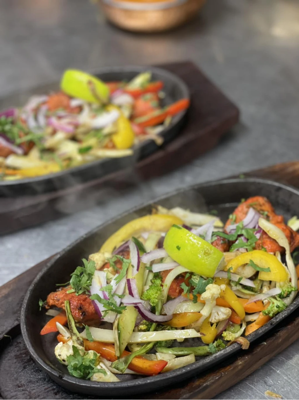 Sizlar är en speciell järnform som serveras med rykande het på bordet med bädd av lök, broccoli, blomkål, vitkål, morot, paprika toppad med färsk koriander, citron och masalasås vid sidan.
